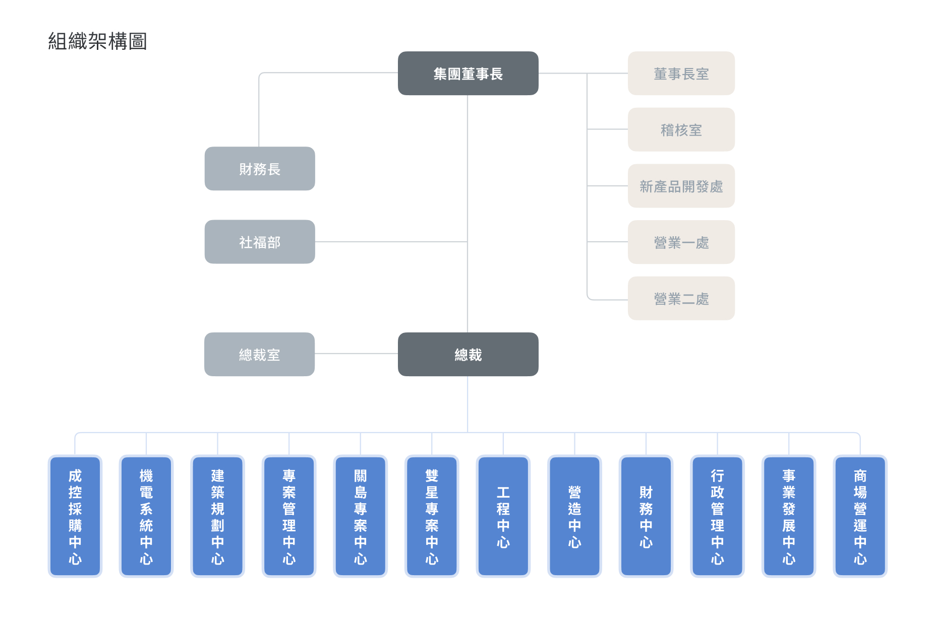 成控採購中心統籌集團開發案的成本控管與採購策略,設有「土建工程採購處」、「機電工程採購處」與「成控處」,分別負責土建與機電工程等項目採購、比議價、報價分析與供應鏈管理。中心致力於建立標準化、透明化的採購制度,平衡品質、成本與風險,強化集團營建效率與成本競爭力。